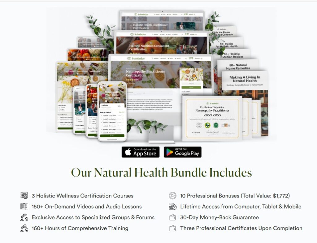 | Scholistico – Natural Health Bundle | ~$275 Limited Time | Wellness professionals or people serious about holistic health | Multi-course bundle | Money-back guarantee |