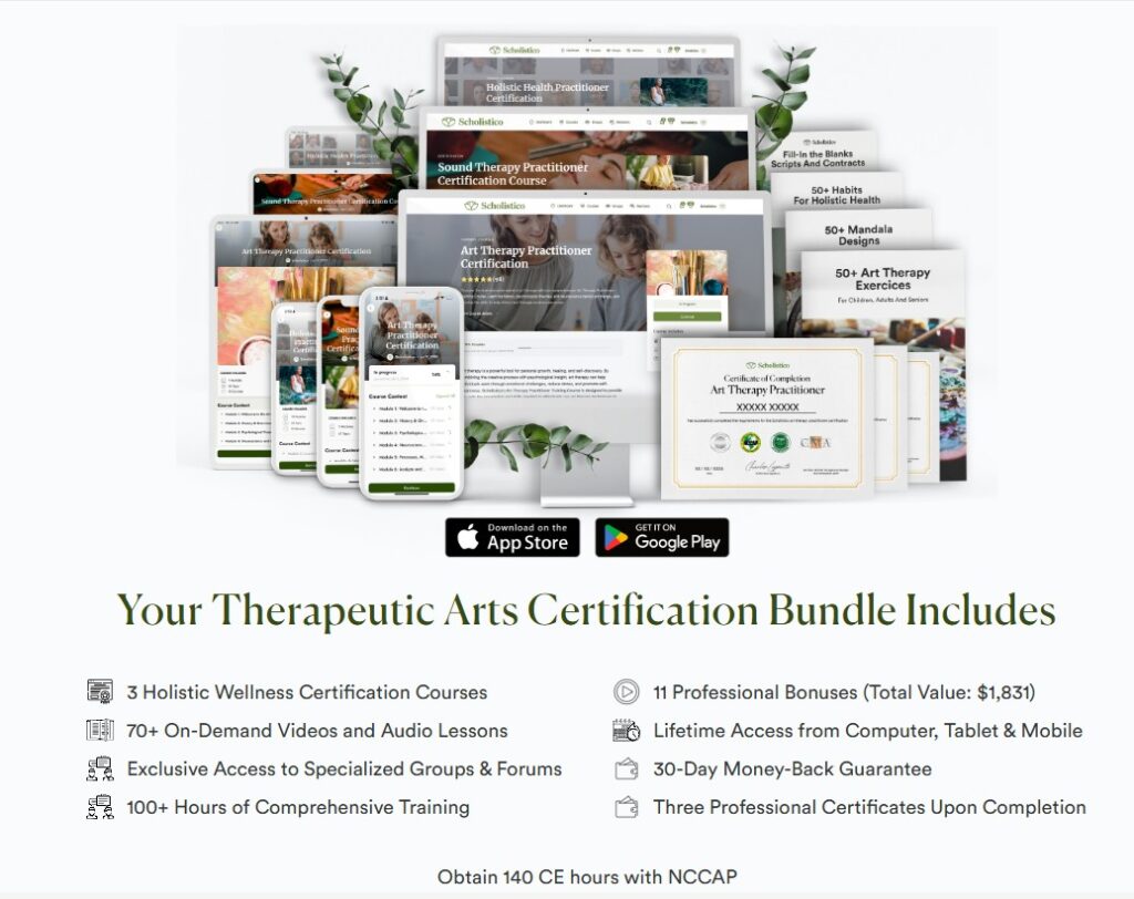| Scholistico – All Certification Courses | ~$97 through Dec. 1, 2025 | Beginners exploring holistic / art therapy fields | Video + audio + PDFs | Money-back guarantee |